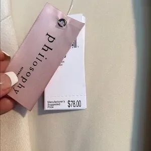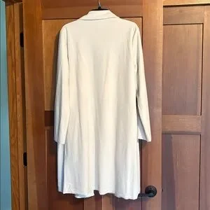 Chic cream trench coat by Philosophy. Sleek design with a classic collar. Ideal for versatile styling.