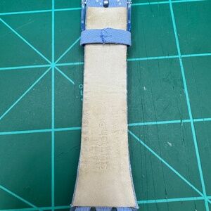 Running Swatch Hazy Daisy 34 mm 2004 quartz watch with cloth over leather backing band. Some sweat stains visible, especially on back of band. One chip out of right upper watch where it meets the band (see close up photos). New battery and keeps great time. This watch shows wear, and still has some fun days ahead! Price reflects this.