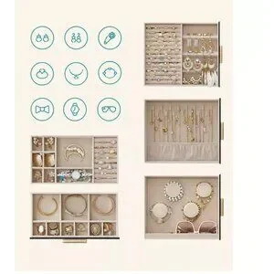 The three side drawers are designed to hang necklaces and pendant earrings, preventing tangling. They also provide ample space for rings, stud earrings, bracelets, and watches. The top tray and bottom drawer offer additional storage for pins, hair accessories, and other small items.