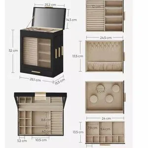 This jewelry box features three interchangeable side drawers, allowing you to customize the display of your favorite pieces. Your valuables are safely kept dust-free behind the clear glass window.