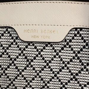 Beautiful black and white statement tote/satchel from Henri Bendel. Silver tone hardware. Clean inside with purple lining and Henri Bendel logo. One side has zipper pocket and other side has two slip pockets. Will be sent with an unbranded dust bag.