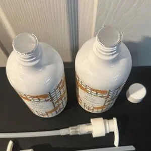 Pair of Beekman 1802 Spiced Orange hand and body wash bottles. Comes with two pump dispensers. Features orange and white design.