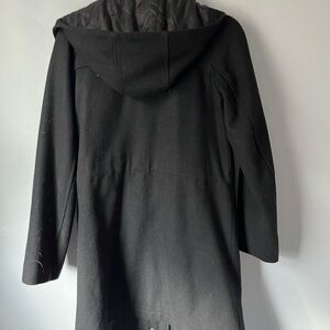 Chic black 3/4 length utility jacket with gold hardware. Features multiple pockets and a hood. Works for both casual and dress.