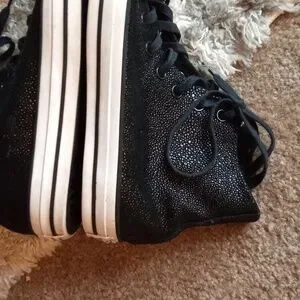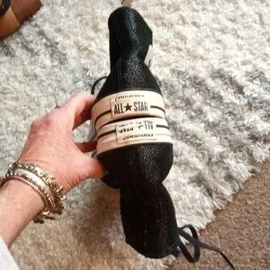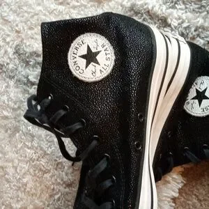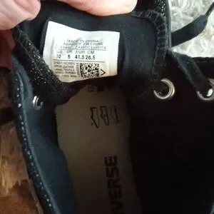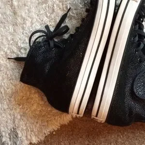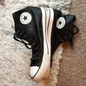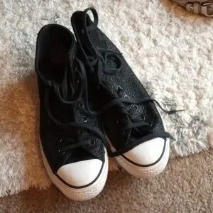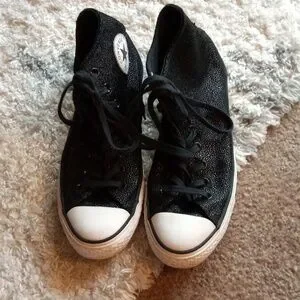 Classic Converse high-tops for adults and women. Black canvas with white toe caps. Perfect for everyday wear. Shiny black textured. No wear on tread. One flaw listed on the right heel. Lace up high tops. Sold as listed in pics. See pics for details. Size 10.