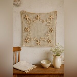 French Vintage 3D Handmade Crochet Floral Beige Tablecloth Cottagecore Decor