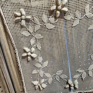 Beautiful handmade French vintage 3D crochet lace tablecloth featuring raised floral details and intricate woven craftsmanship.