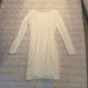 Details: Beautiful white long sleeve mid-length dress with detailing overlay and white lining underneath. Hidden zipper on left side. Designed to form fit the body. Perfect for a dinner party or cocktails with friends.