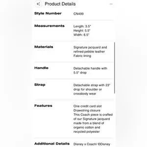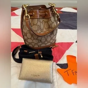 Stylish Coach bucket bag with Mickey Mouse design. Features brown leather accents and gold hardware. Includes a matching gold cardholder. Strap is removable and adjustable. Smoke free. Used once. Very clean and no flaws. Makes a good gift. No returns. No offers.