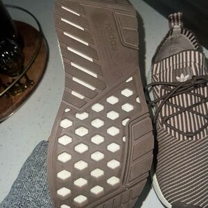 Sleek Adidas shoes with a taupe upper and cream accents. Features iconic stripes and a comfortable sole.