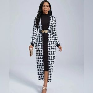Houndstooth Print Belted Longline Blazer Dress - Black and White