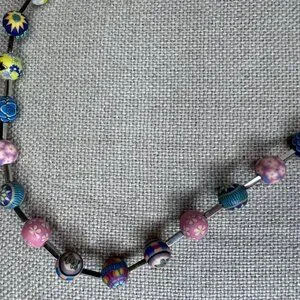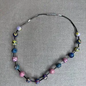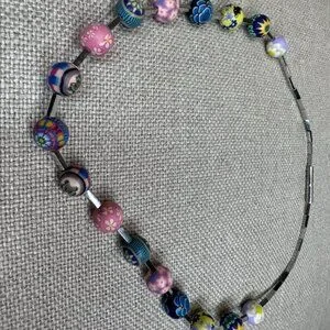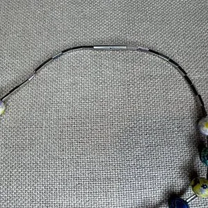 A lady’s PILA necklace featuring multi-coloured floral motifs made from 326L flexible stainless steel and 17 polymer clay beads. It has an easy closure with a hallmark on the clasp.