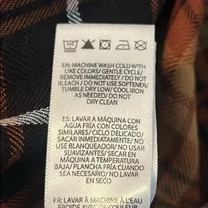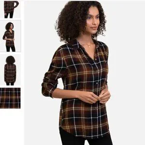 Our crinkled rayon button down shirt features allover plaid with single chest pocket, long-sleeve, drop back hem, relaxed drape and feminine rounded.