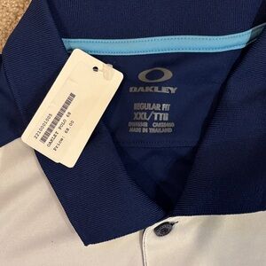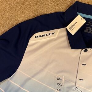 Stylish Oakley polo with a navy and white gradient. Features a modern geometric pattern. Ideal for versatile wear.