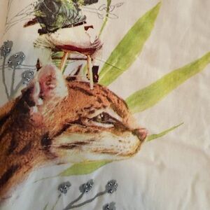 This airy ivory blouse features a stunning all-over nature print with owls, butterflies, flowers, and birds — a true wearable piece of art.