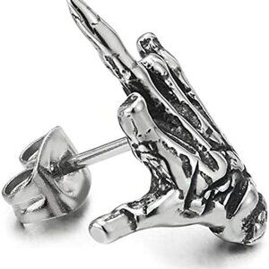 Mens Womens Stainless Steel Vintage Hand Skeleton Bone Stud Earrings, Screw Back