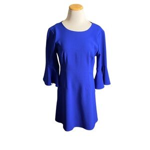 Striking cobalt blue Vince Camuto shift dress with a polished, structured silhouette. Features statement bell sleeves and a clean neckline for a modern, flattering look that works for events, work functions, or evening wear. Fully lined with a back zip closure for a smooth fit.