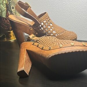 Step out in style with these chic woven slingback shoes. Featuring a beautiful tan and white design, these shoes are perfect for any occasion. Enjoy comfort and elegance with every step. Please note has some wear & tear but still in good condition