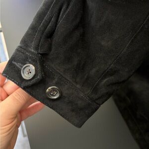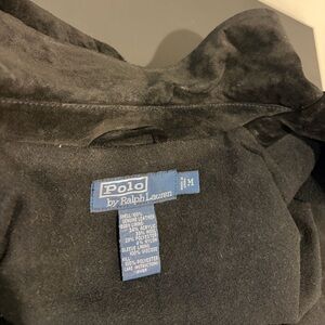 Sleek black jacket by Ralph Lauren. Classy and versatile. Perfect for any occasion. Very difficult to capture the amazing quality in photos due to the deep black color and leather suede material. It’s in amazing condition and extremely soft. It is heavy