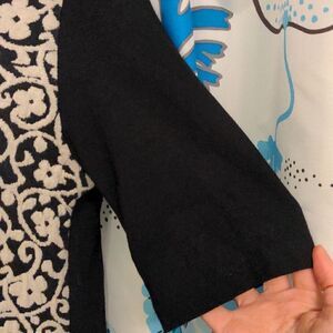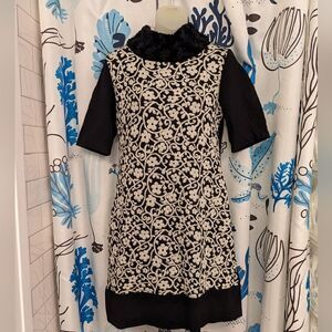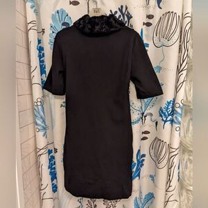 Casually glamourous black and white dress with a soft faux fur collar. Made of sturdy black cotton knit with an off-white flower and vine design with a slightly raised texture.