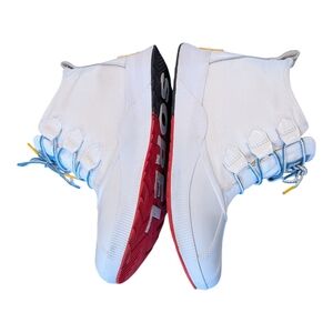 Stylish white high-top sneakers featuring blue accents and unique lace design. Perfect for casual wear.