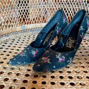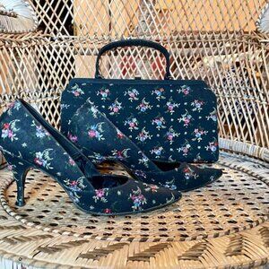 Mad Men era kitten heels and matching purse in a black fabric and floral design. Size 7N.