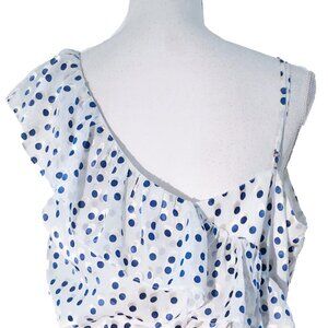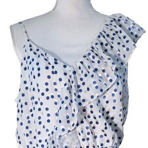 This Madelina dress by Lilly Pulitzer features the Bennet Blue Polka Dot print in blue and silver. It's made of 54% polyester and 46% rayon and has a lining that's made of 100% polyester. One shoulder of this dress is an adjustable spaghetti strap while the other is a regular sleeveless shoulder with a ruffle. There's also a ruffle on the bottom hem.