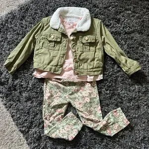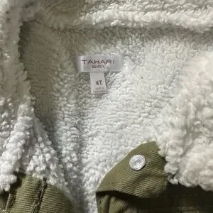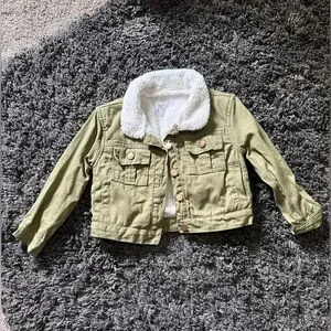 Olive jacket with soft white fleece lining. Features button details. Ideal for warmth and style.