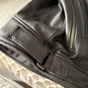Classic black leather jacket with multiple zippered pockets. Durable and stylish design. Perfect for riding or casual wear.