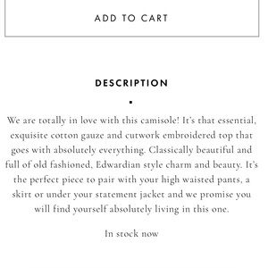 We are totally in love with this camisole! It’s that essential, exquisite cotton gauze and cutwork embroidered top that goes with absolutely everything. Classically beautiful and full of old fashioned, Edwardian style charm and beauty. It’s the perfect piece to pair with your high waisted pants, a skirt or under your statement jacket and we promise you will find yourself absolutely living in this one.