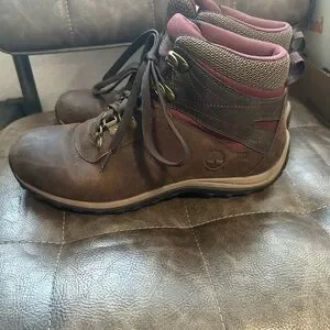 Stylish and sturdy hiking boots. Features brown leather with burgundy accents. Worn only twice.