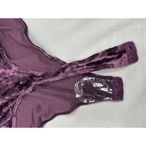 The Free People Don't You Wish Purple Velvet Bodysuit in size S is a top with puff sleeves and a V-neckline. This bodysuit is made from a polyester/elastane blend velvet fabric, making it machine washable and stretchy for easy care. Perfect for various occasions such as travel, parties, or casual wear, this bodysuit features a snap closure and is adorned with a solid purple color.
