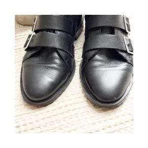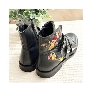 Make a bold statement with these ZARA Trafaluc black leather ankle boots, size EU 40 (US 9). Featuring triple silver buckles, side zippers, and vibrant floral embroidery at the heel, these boots blend edgy and romantic vibes effortlessly. The smooth leather finish and sturdy sole offer comfort and durability. Light wear on soles; uppers in excellent condition. Perfect for fall layering, festival looks, or adding a pop of personality to minimalist outfits.