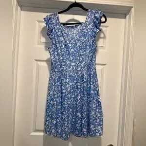 This casual sundress features a square neckline and flutter cap sleeves, perfect for a relaxed summer day. The blue and white floral pattern adds a touch of elegance to the flowing silhouette, making it a versatile choice for any casual outing.