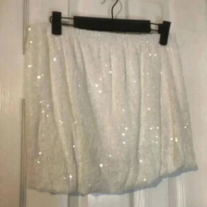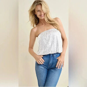 This white top features a dazzling sequin embellishment all over with ruched detailing for added texture.