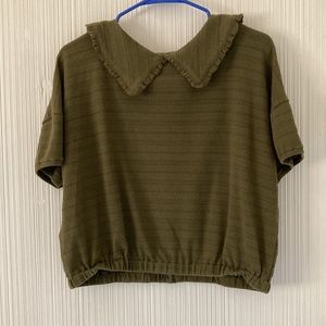 Short-sleeve button-up top. Features a textured design and a ruffled collar.