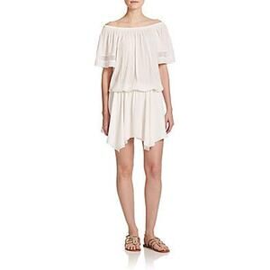 A romantic Ramy Brook dress in a soft, silky weave. Smocked elastic traces the off shoulder neckline, and sheer insets accent the short sleeves. Elastic waist. Unlined. Fabric: Sateen.