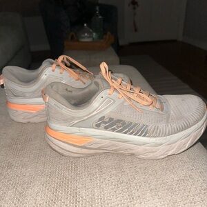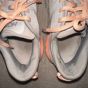 Elevate your run with Hoka's stylish athletic shoes. Gray base with peach accents. Designed for comfort and performance.