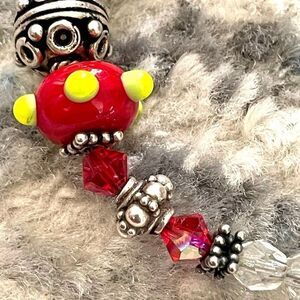 Red lamp work bead bracelet with silver and Swarovski crystals