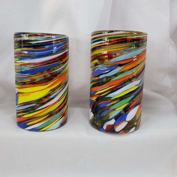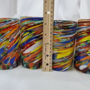 This set of four handcrafted glass tumblers features a vibrant multicolor swirl design, adding an artistic touch to your drinkware collection. With a generous size, these tumblers are perfect for serving beverages or as decorative pieces. Their unique, colorful pattern ensures each piece is one-of-a-kind.