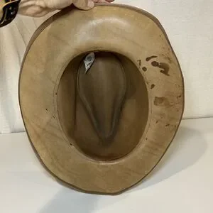 The Vtg Henschel Skullys Braid Suede Hat is a vintage cowboy hat made of cowhide leather with a braided design. This large size hat in brown color is perfect for casual occasions in all seasons. The Outback hat style is influenced by the USA theme, making it a unique accessory for men looking to add a touch of western flair to their outfit. Handcrafted in the United States, this high-quality leather hat from a reputable brand like Henschel Skullys is a stylish and timeless piece for any wardrobe.