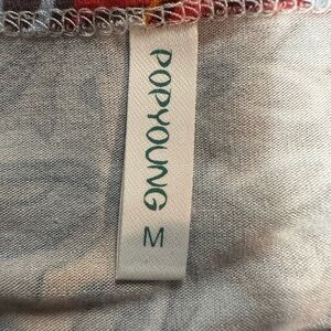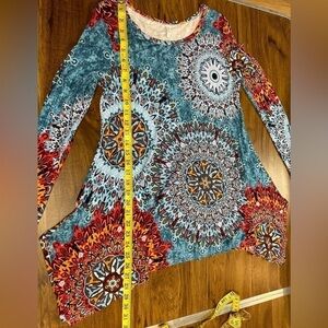 Popyoung Long Sleeve Tunic, Handkerchief Hemline. Shades of blue, red, orange medallion design. Women’s Size Medium. Flowy swing style. Nice drape. Quick dry, easy care fabric. Lightweight. Scoop neckline. Excellent preowned condition.