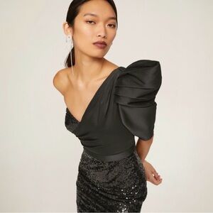 ✨ One-shoulder design with sculptural statement sleeve
