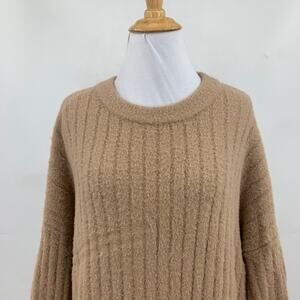Aerie Sweater Womens S Small Stone Fuzzy Cozy Ribbed Oversized Crewneck Pullover
