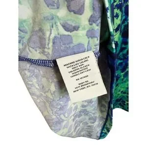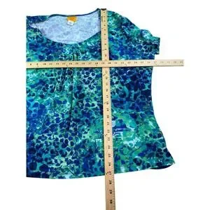 Ruby Rd. (Ruby Rd. Woman line). Women's short sleeve scoop neck shirt in green and blue abstract print, tag size 3X. Made from a soft, flowy fabric with front pleats for drape and a relaxed pullover silhouette. Machine wash cold with like colors, tumble dry low. A comfortable plus-size top from the Ruby Rd. Woman collection. Any significant wear or damage is noted or shown in the photos. All measurements provided are approximate and should be used as a general guide. Due to inconsistencies in the display settings, the item color on your monitor may not accurately represent the actual color.