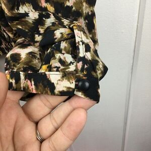 PJK Patterson J. Kincaid Leopard Print Wrap Top, Leather Trim & Buttons, Size Medium. 100% polyester. Trim & buttons: 100% Italian Leather. Cream w/ leopard print in black, pink & gold. Excellent condition with no holes or stains. Wrap front w/ snap closure. One leather button on hem of each sleeve. A double leather button detail at the bottom of the wrap. Gorgeous top!