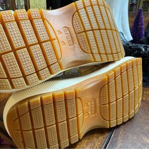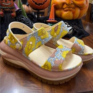 Stylish CROCS platform sandals with floral design. Features yellow and cream colors. Comfortable and trendy. EUC. Smoke free home.