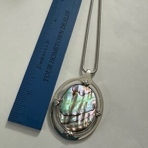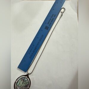 Vintage Whiting & Davis necklace with an iridescent pendant. Silver chain and frame. Adds sophistication to any look.