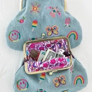 Natural Life Embroidered Kisslock Coin Purse; Denim NWT