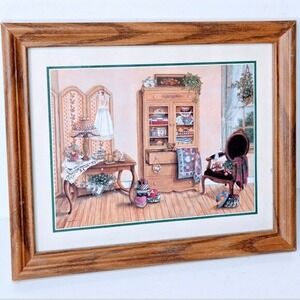 Add warmth and nostalgia to your space with this charming vintage art print featuring a cozy country cottage interior. The scene captures a beautifully detailed room complete with a quilt cabinet, antique vanity table, lace lampshade, and rustic wood floors. From the tiny slippers to the delicate teacups, this artwork is filled with homey, heartwarming touches.