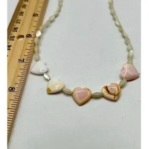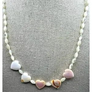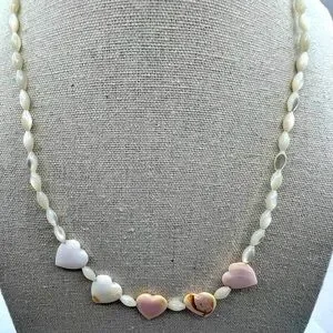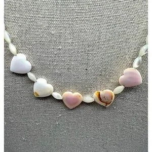 This charming, vintage necklace features heart-shaped shell accents interspersed with delicate mother of pearl beads. Each heart tells a story of the ocean, with their subtle variations and natural imperfections adding character to this exquisite piece. The soft pink and white hues evoke a sense of timeless elegance and connection to nature. Perfect for expressing love in a tangible form, this necklace is a heartfelt accessory that will complement any outfit.
